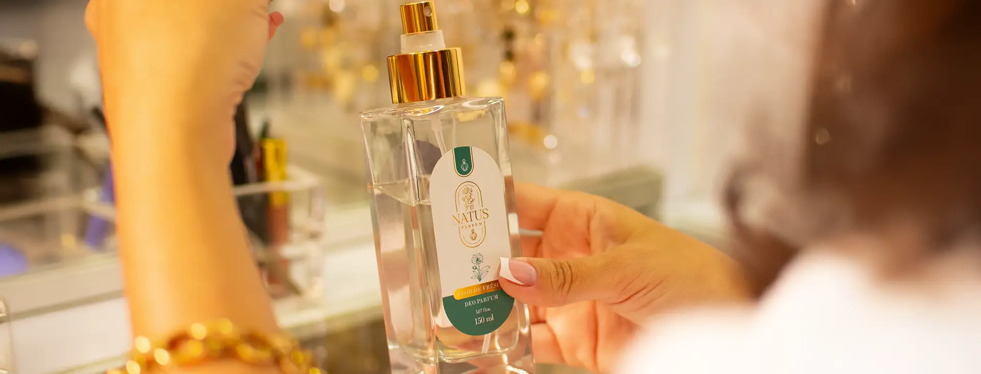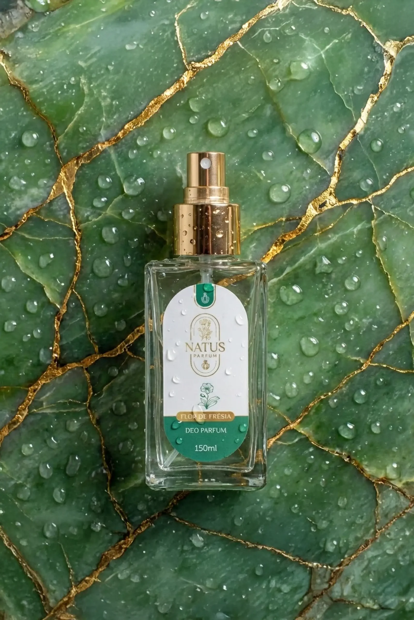 O design do frasco de vidro retangular com válvula spray dourada reflete a qualidade e o requinte do perfume que guarda.