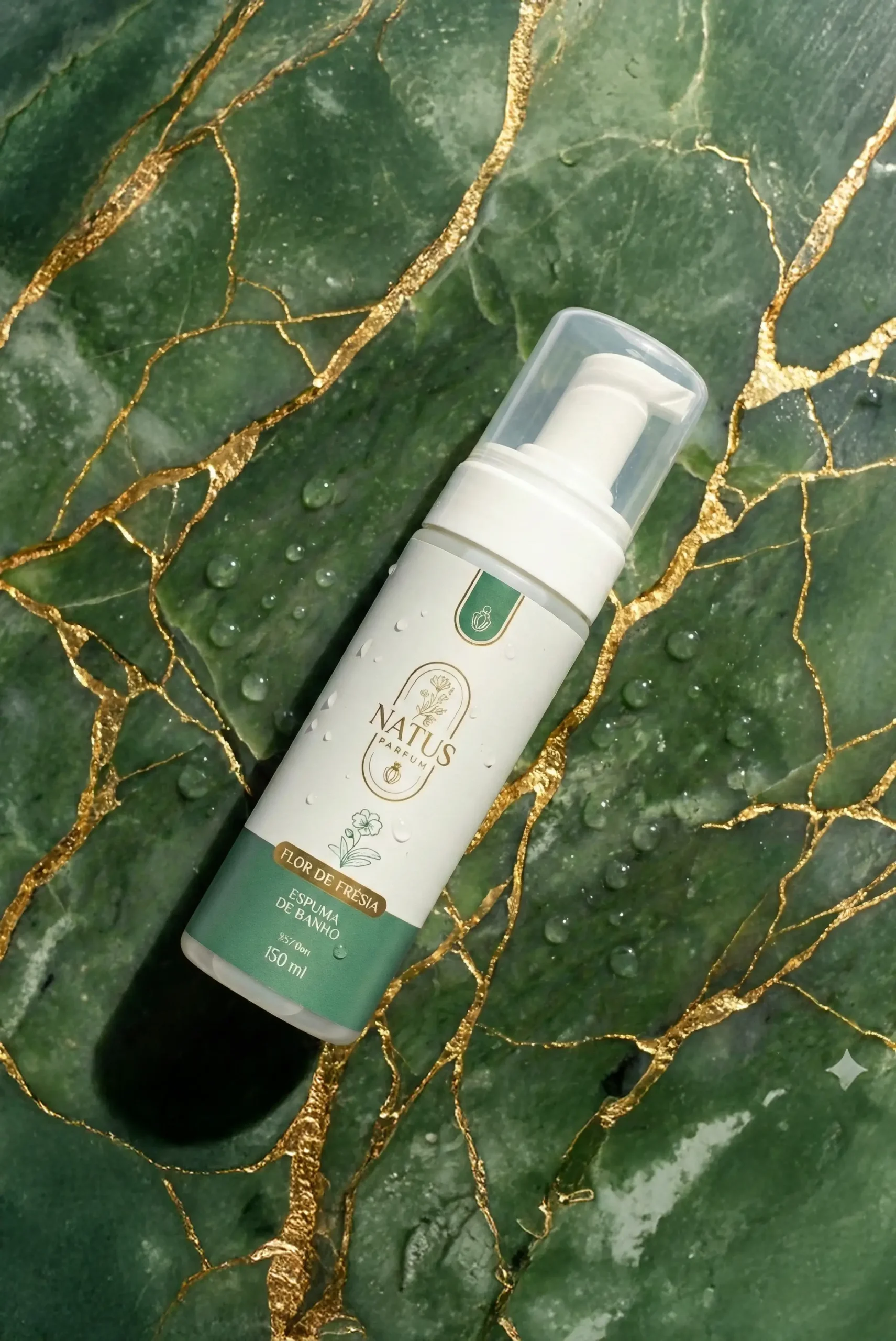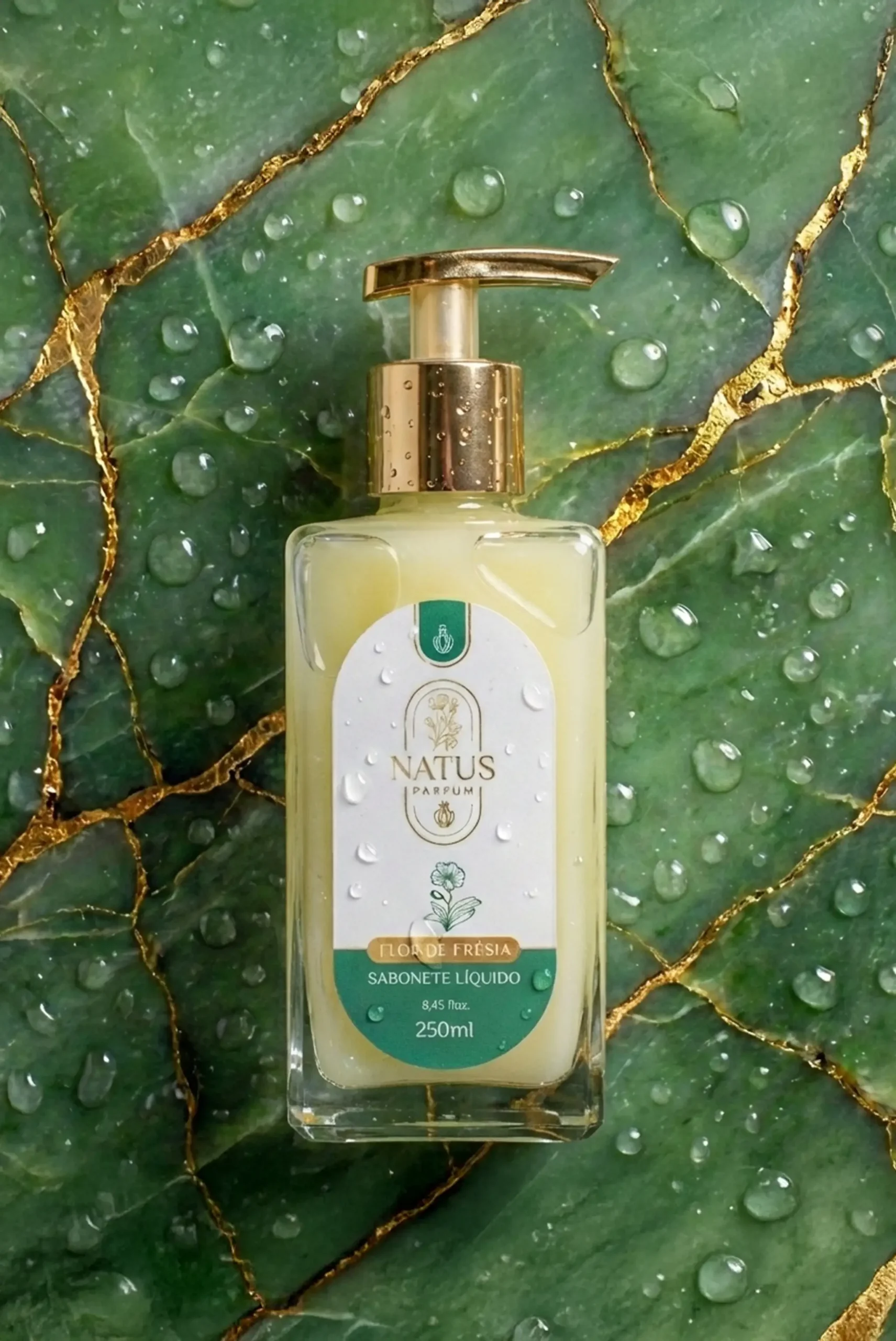 O frasco elegante com válvula pump dourada traz praticidade e sofisticação para sua rotina de cuidados.